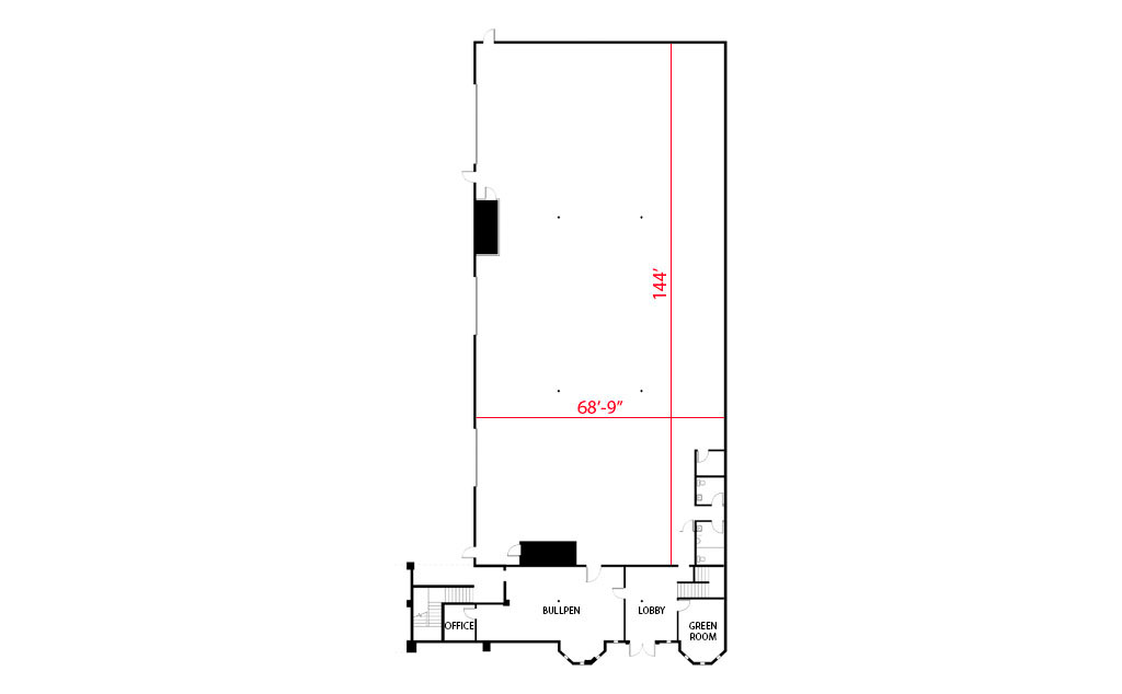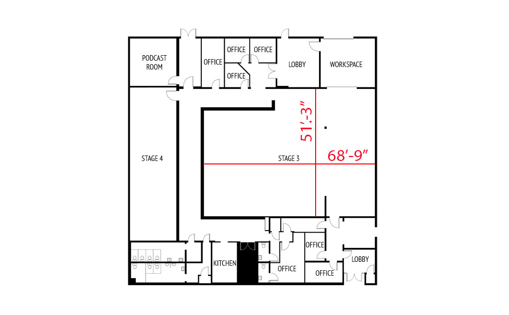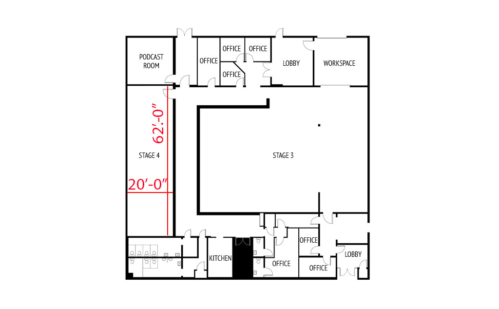 Stage 2 provides over 13,500 square feet of adjustable production space with adjacent administrative and creative offices. This makes it an excellent choice for larger projects requiring both studio and behind-the-scenes workspace. The ability to coordinate production operations and creative planning in contiguous space streamlines workflows and reduces logistical overhead.