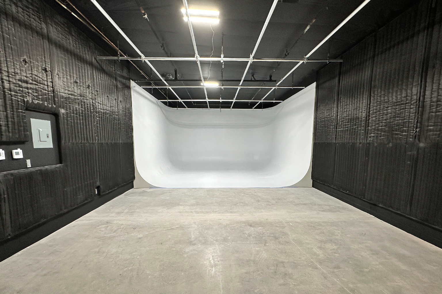 - Stage 4 – Compact white cyc stage with an overhead grid and sound-treated walls. Ideal for interviews, product shoots, and controlled-lighting setups.